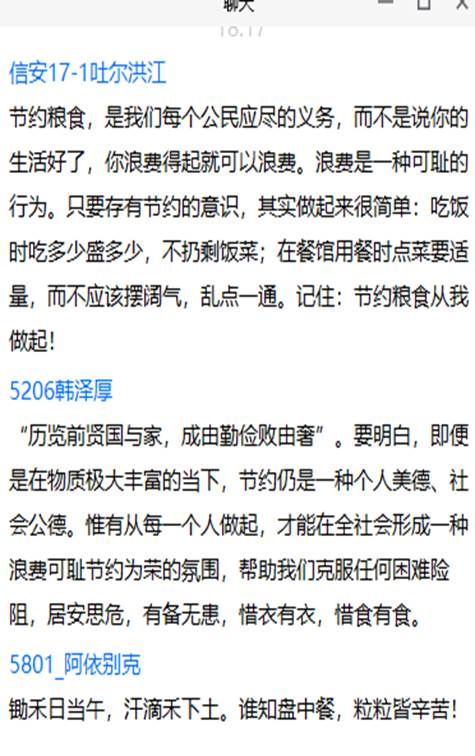 有的同学在宿舍集中学习并讨论分享,有的同学在家学习并在腾讯会议聊天区讨论分享,将学习内容入脑入心,践行到实际行动中。本次主题团日活动分为三个部分,一是我国粮食浪费现状,二是习近平总书记重要指示,三是节约粮食我们在行动。