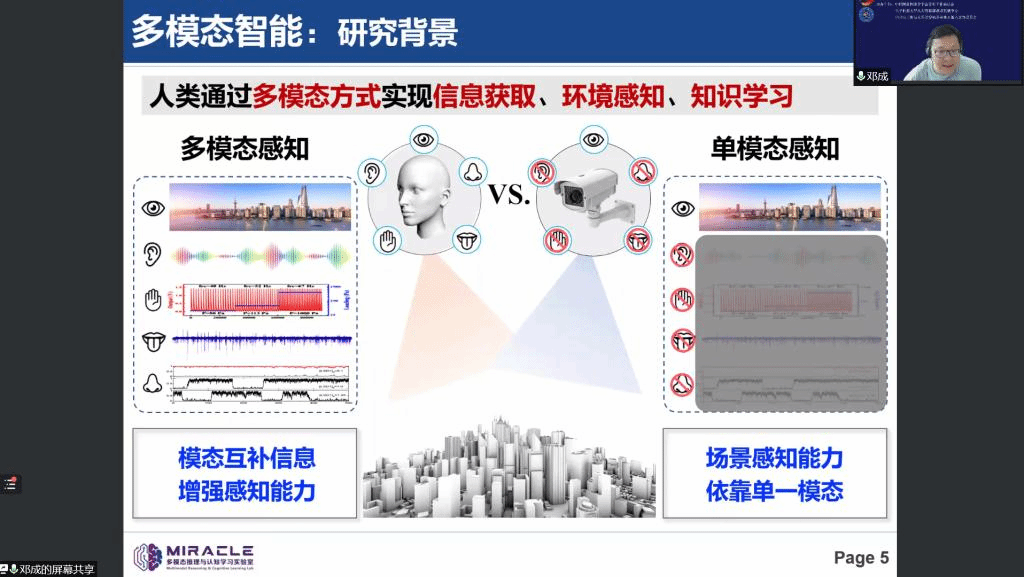 邓成教授在《多模态数据的认知与推理》的报告中指出,媒体大数据时代,图像、视频、文本和音频等多模态数据大量涌现,且类型多样、关系复杂。而人类的信息获取、环境感知、知识学习,都是以多模态方式来进行。由感知走向认知和推理,多模态智能更能应对复杂的数据和场景。多模态数据的认知与推理是多模态智能的瓶颈问题。针对现今多模态数据的认知与推理所面临的机遇与挑战,邓成教授分别从多模态数据表示、多模态知识推理、多模态鲁棒学习三个方面介绍了团队的最新研究成果。